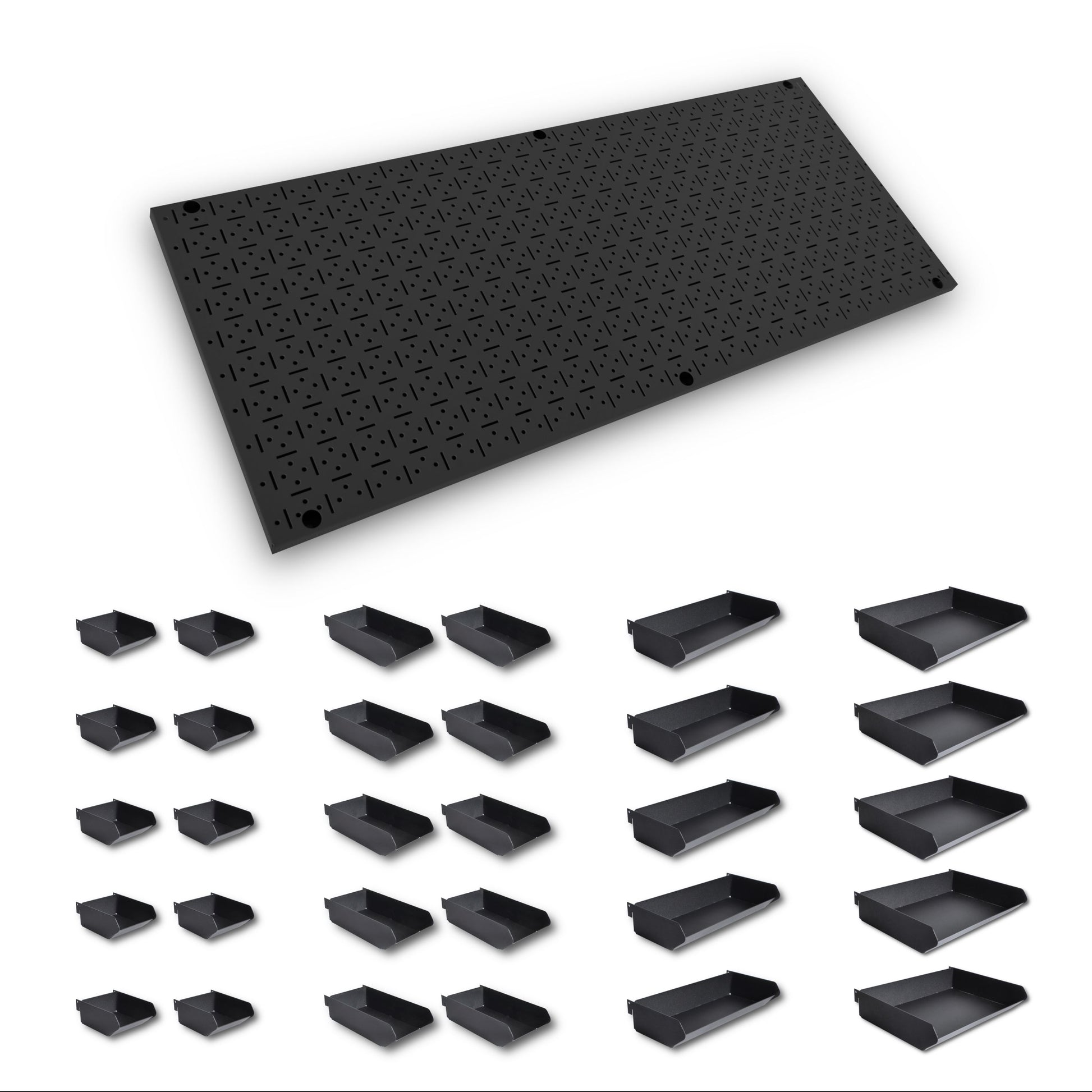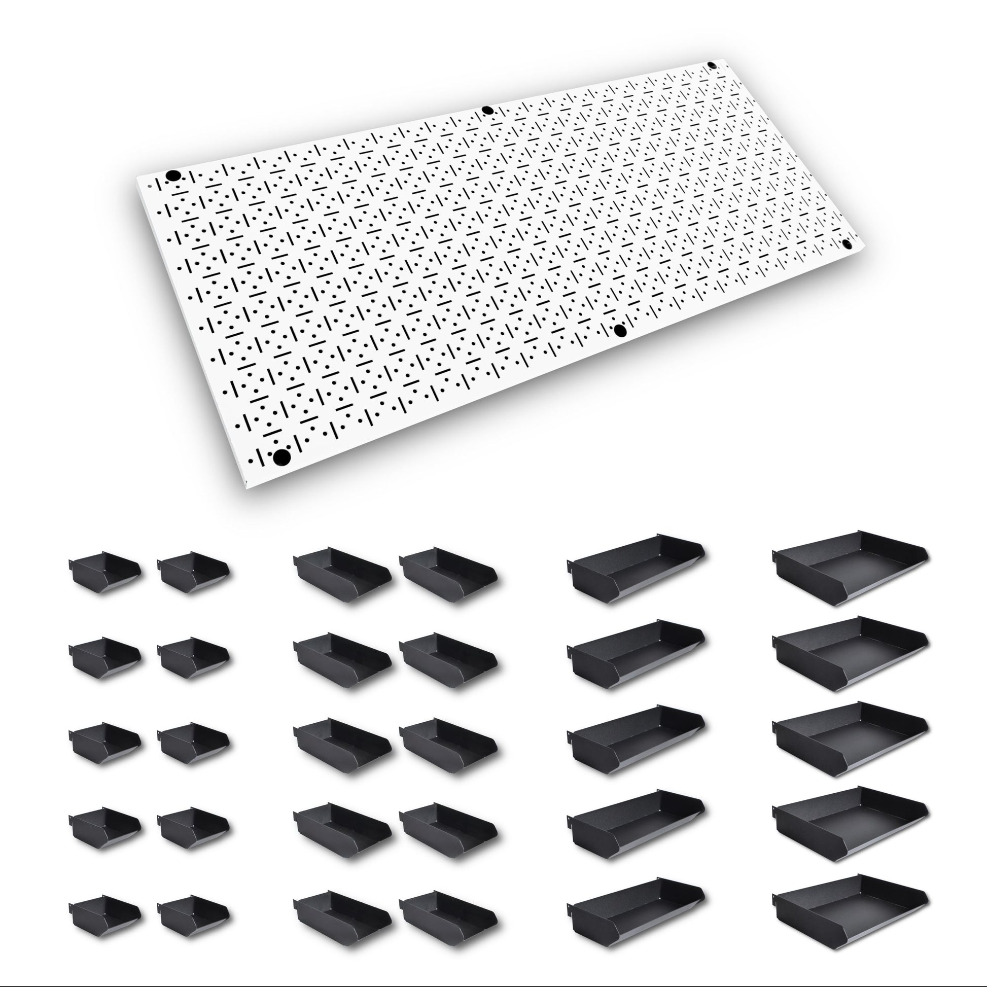 Choosing the right accessories for a pegboard (both in type and quantity) is essential to getting the most out of your storage. This combination of a large 1200x500 pegboard and mixed storage bins sizes aims to optimise the storage of a large variety of your smaller components.